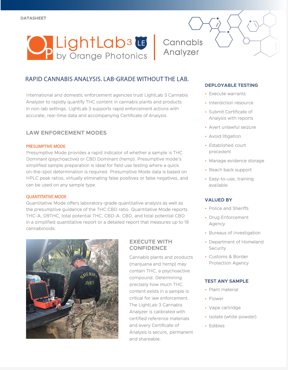 LightLab 3 LE (Law Enforcement) Cannabis Analyzer is capable of analyzing 19 cannabinoids plus semi-quantitative terpenes in 6 sample formats.